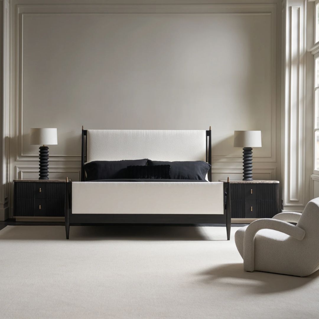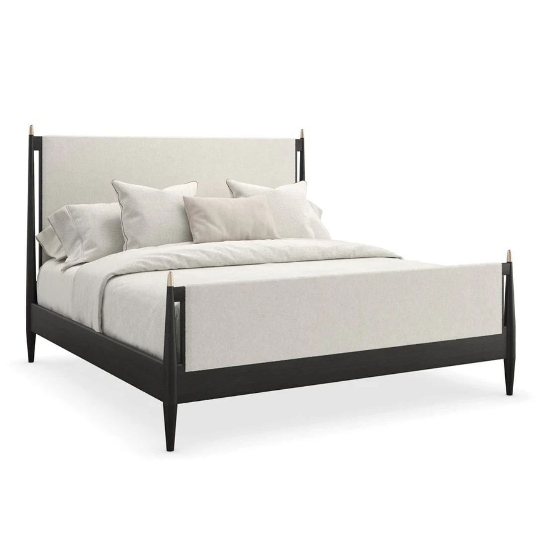 With flowing modern lines and a rich use of material, the Rhythm king bed brings a simple yet sophisticated cadence to bedroom interiors. Tailored in a luxurious ivory boucle fabric, its clean, parsons-style headboard lends soft contrast to a Black Stained Ash wood frame. Metal finials in a Lucent Bronze finish accentuate subtly tapered posts with a note of luxe.