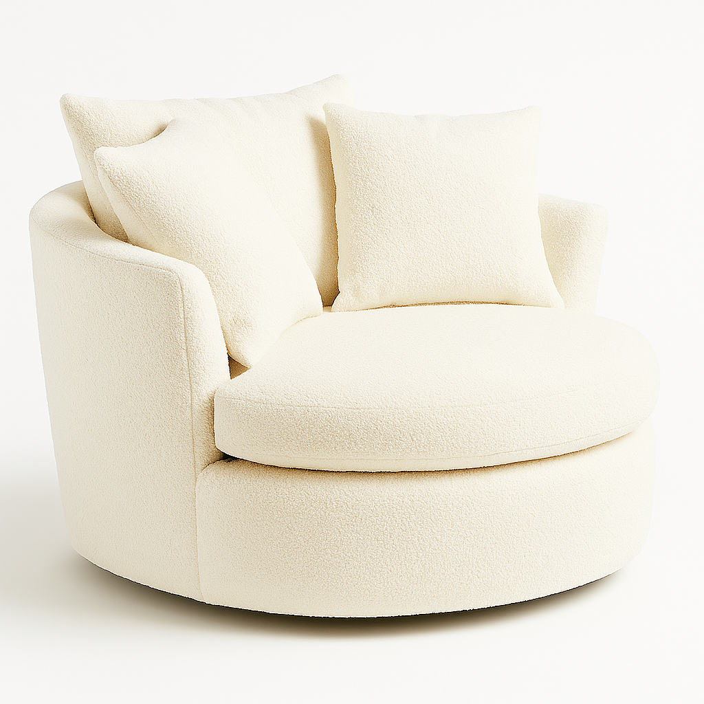 The Suli Chair brings modern comfort and sculptural elegance together in a beautifully inviting design. Wrapped in a soft, creamy boucle-style upholstery, this generously cushioned swivel chair offers a cozy retreat perfect for reading, lounging, or creating a statement corner in any living space. The rounded silhouette embraces the sitter with its gently curved back and deep, circular seat, while the plush loose pillows provide customizable support.